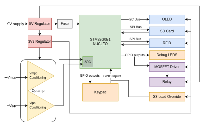 The project was based on the provided STM32 Nucleo-G0B1RE micro controller with plenty of peripherals for all the necessary functionality. Firstly a stable 5V and 3.3V regulated supply was implemented to provide power to the STM and other components on the board. Custom gain and offset op-amp circuits were designed to condition the mains voltage and current signals for the 12-bit ADC.
