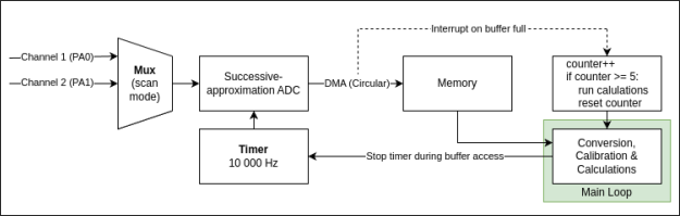 Due to resource constraints on the STM board, efficiency was key. I utilized Direct Memory Access (DMA) to handle high-speed sampling without bogging down the CPU.
